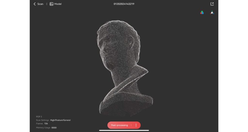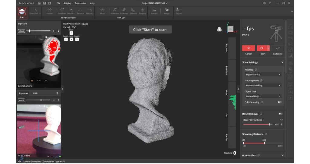 As for the scanning software itself, the Revo Scan app is essential to generating and post-processing 3D scans. Once you connect your POP 3 to your compatible device, you’ll use the software to start the scan, monitor the progress, make adjustments to the point cloud data, and export the final model.