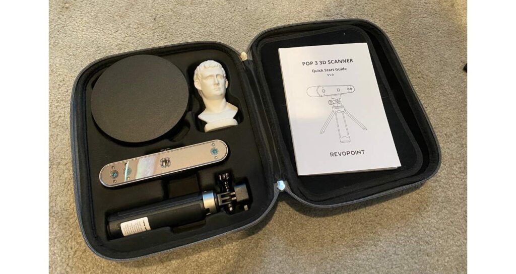 The Revopoint POP 3 arrives in a compact white package. Once you tear through the box, you’ll find a felt-wrapped carrying case that both looks and feels very high quality.