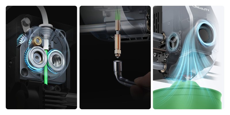 While an integrated, full-metal nozzle-heat break design and direct extrusion enable flexible filament printing, with a 60W hot-end and 360° surround ceramic heating, the Ender-3 V3 also ensures efficient filament melting for high-speed printing with ABS and PETG. Apart from other common filaments like PLA and TPU, the model can also handle carbon materials including PLA-CF, PETG-CF and CR-Carbon, catering to professionals and enthusiasts alike.